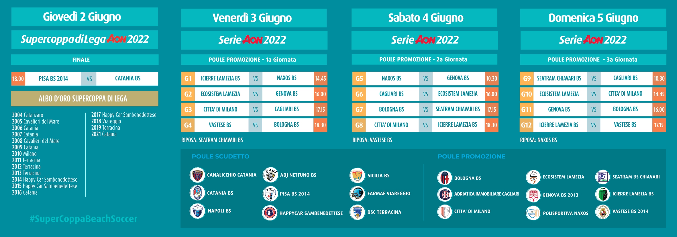 Parte dalla suggestiva spiaggia davanti alla Nave di Cascella, nel centro nevralgico di Pescara, la 18^ edizione del Campionato Beach Soccer FIGC-Lega Nazionale Dilettanti. Un avvio in grande stile con la Supercoppa in programma giovedì 2 giugno alle 18.00 davanti alle telecamere di SkySport che riprenderanno in diretta l’evento (SkySport Calcio, canale 202). Il Pisa trionfatore della Serie A 2021 e il Catania detentore della Coppa Italia dello scorso anno si contenderanno il primo trofeo della stagione. Per la prima volta nelle diciotto edizioni della Serie A la Supercoppa si gioca a Pescara che è tornata ad ospitare una tappa del beach soccer FIGC-Lega Nazionale Dilettanti dopo dodici anni (2010).