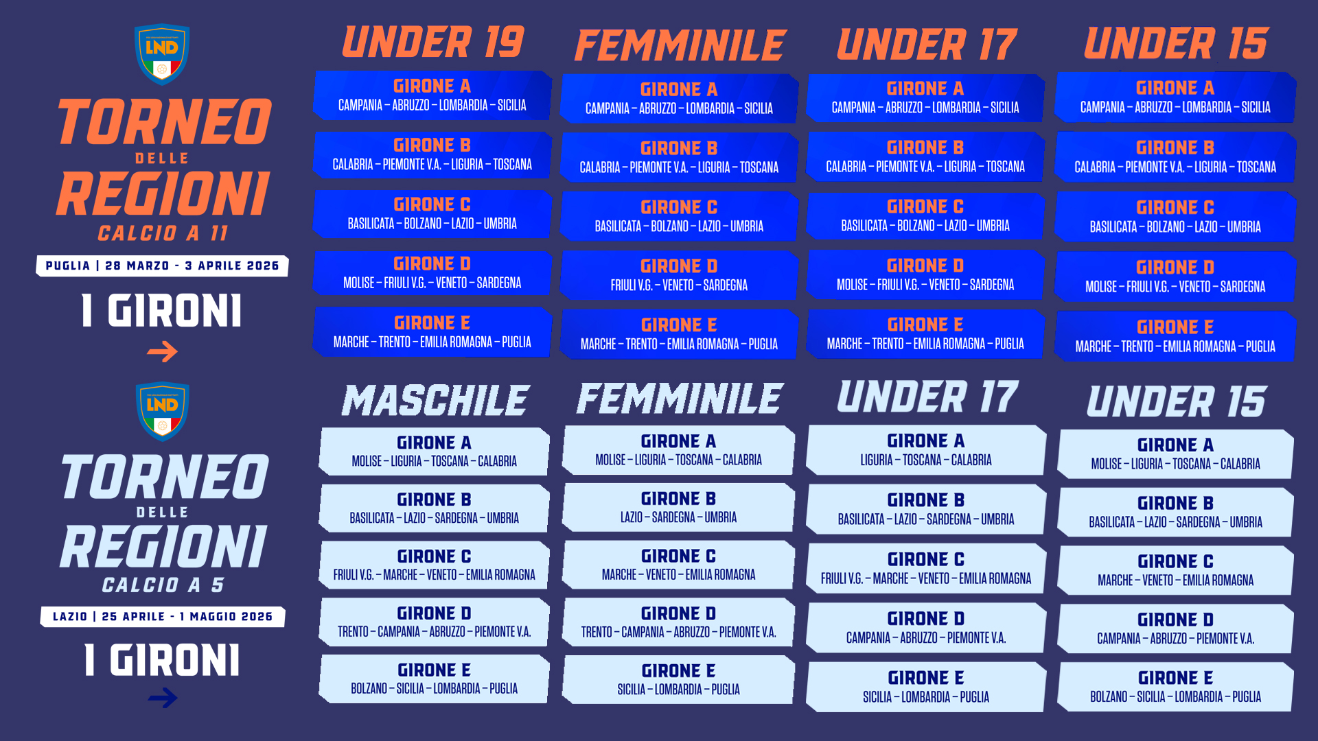 La manifestazione di calcio è riservata alle 79 Rappresentative Under 19, Under 17, Under 15 e Femminili dei diciotto Comitati Regionali e dei CPA di Bolzano e Trento riunite in un unico grande evento che andrà in scena in Puglia dal 28 Marzo al 3 Aprile. L’ultimo Torneo delle Regioni organizzato dal Comitato Regionale presieduto da Vito Tisci risale al 2017 nella competizione dedicata interamente al C5 mentre il calcio a undici torna in Puglia dopo ben 38 anni. Il numero uno del Cr Puglia Vito Tisci ha sottolineato il valore del torneo che va oltre il calcio giocato: ”Giocheremo nelle province di Bari, Brindisi e Lecce. Siamo pronti ad accogliere tutta l’Italia della LND per far scoprire ai giovani calciatori ed alle calciatrici le bellezze della nostra Regione. Siamo certi che sul campo sarà uno spettacolo ma ci teniamo a valorizzare soprattutto l’aspetto sociale della competizione perché il Torneo delle Regioni rappresenta un momento importante di condivisione dei valori dello sport e della vita”.