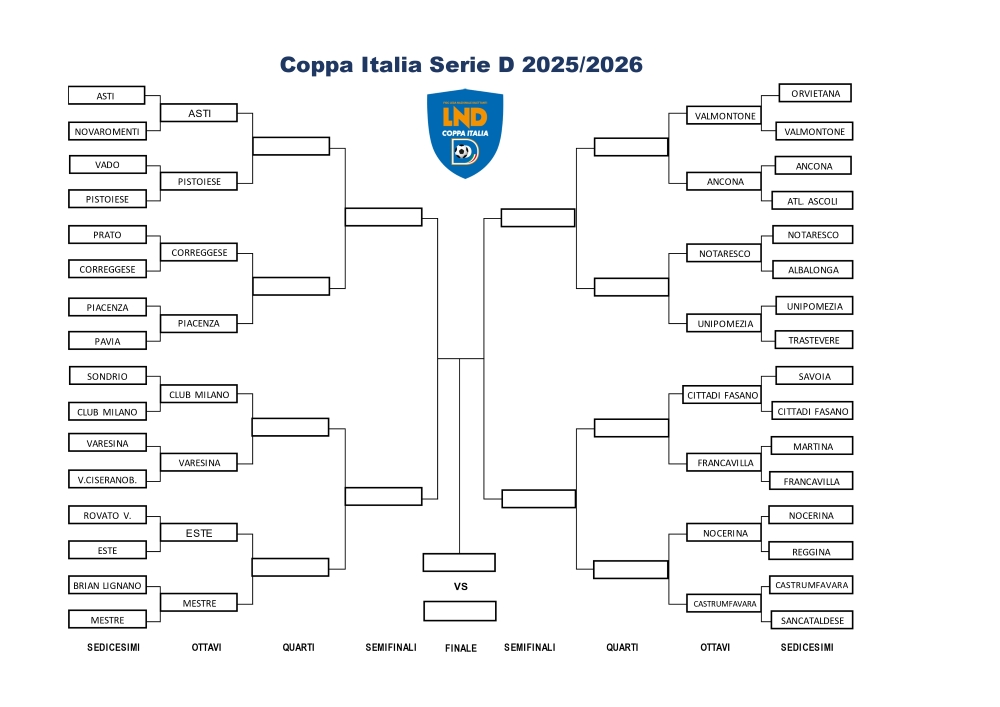 Con il quadro del turno completato, il Dipartimento Interregionale ha effettuato questa mattina il sorteggio per stabilire chi giocherà in casa gli ottavi (19 novembre, ore 14.30) nei casi necessari per rispettare il principio di alternanza casa/trasferta. Di seguito il programma ufficiale: