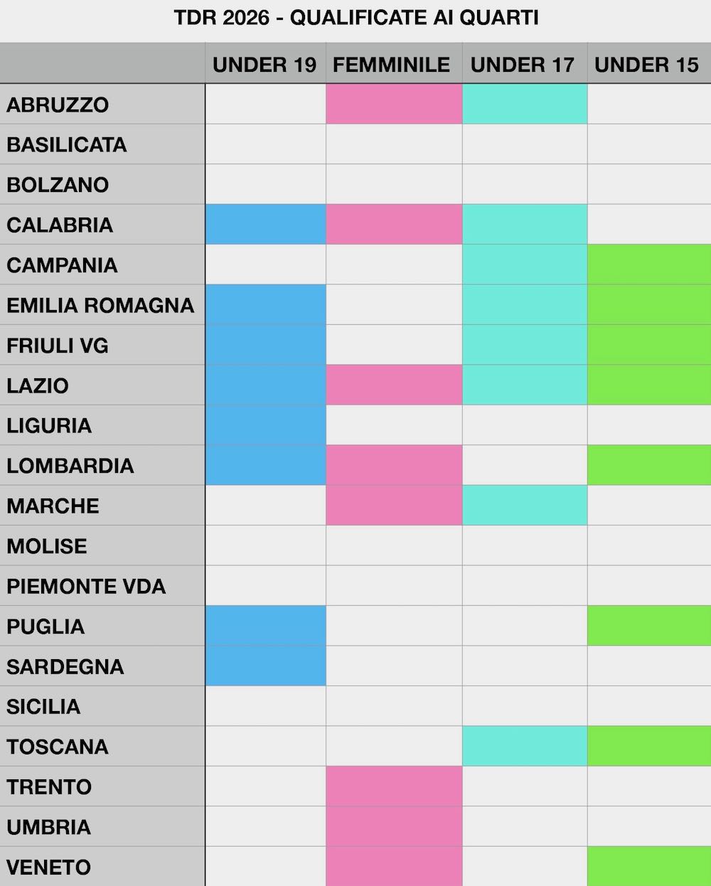 Al termine di questa intensa tre giorni di gare, rimangono in corsa 15 Regioni su 20. Meglio di tutti ha fatto il Lazio, l’unica a portare tutte e quattro le rappresentative ai quarti di finale. Seguono a tre Calabria, Emilia-Romagna, Friuli-Venezia Giulia e Lombardia, a due Abruzzo, Campania, Marche, Puglia, Toscana e Veneto e a uno Liguria, Sardegna, Trento e Umbria.